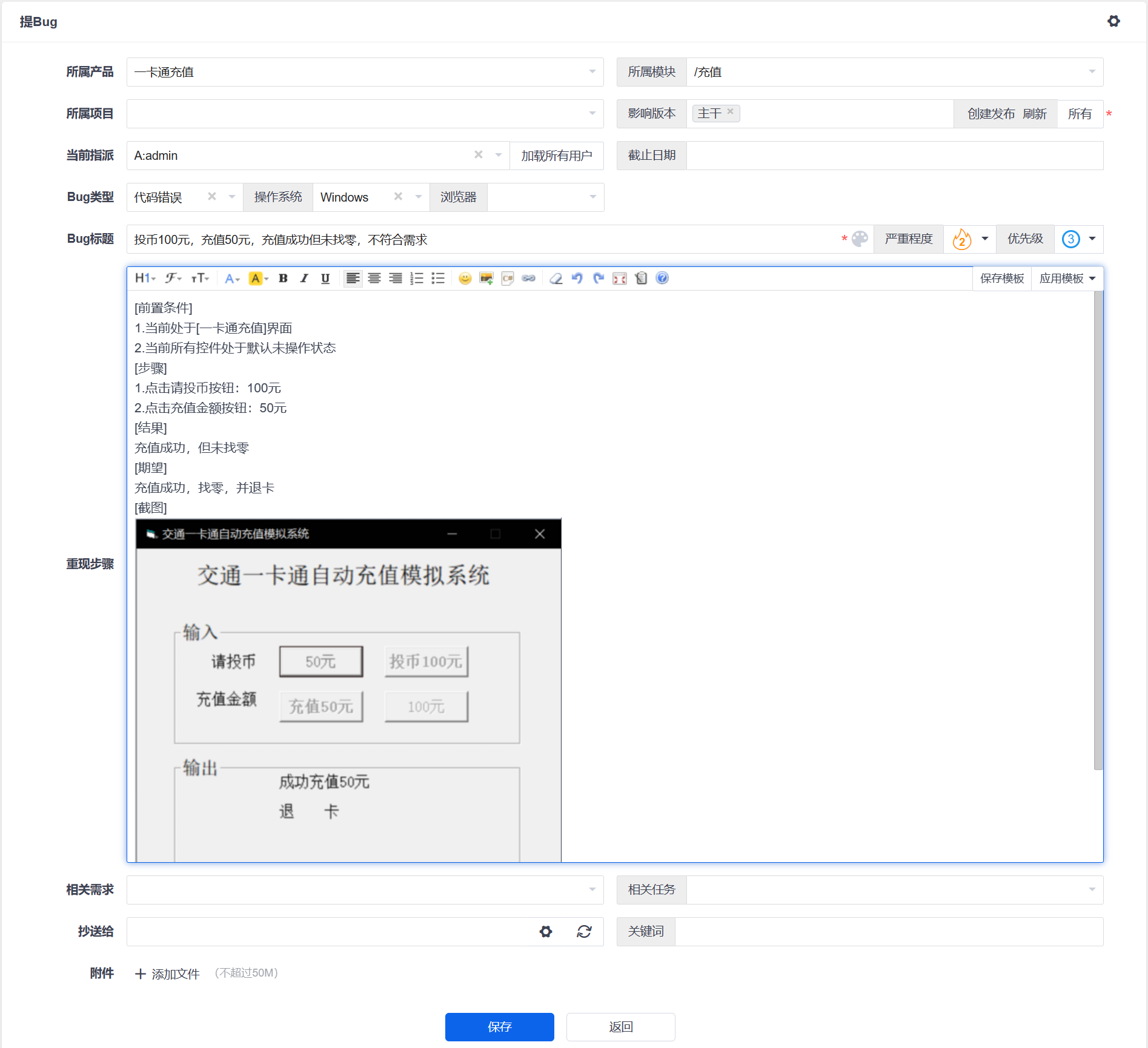 - 附件:发生bug时的界面截图、后台报错日志截图、录屏等