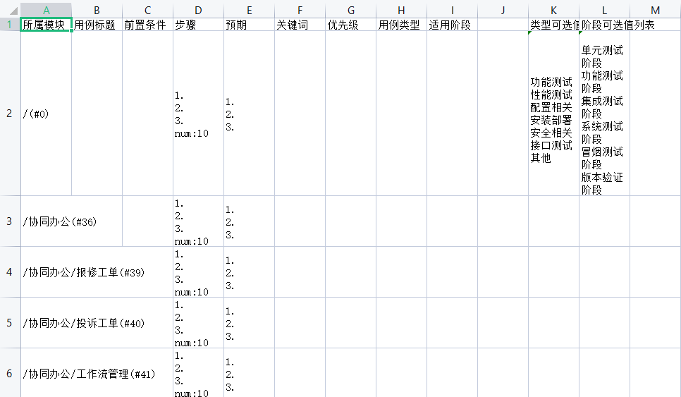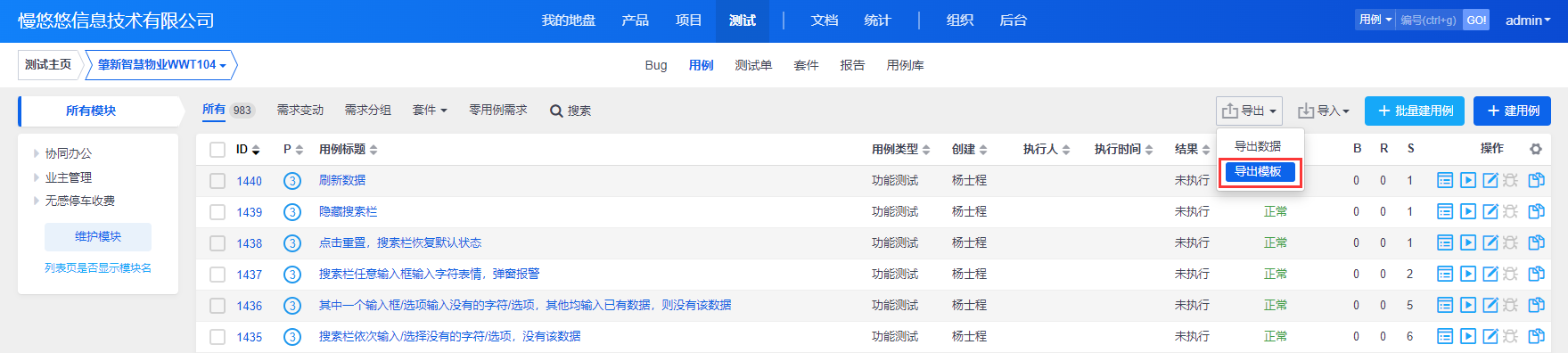 ① 点击【测试】→【用例】→【导出】→【导出模板】,可以将用例模板进行导出: