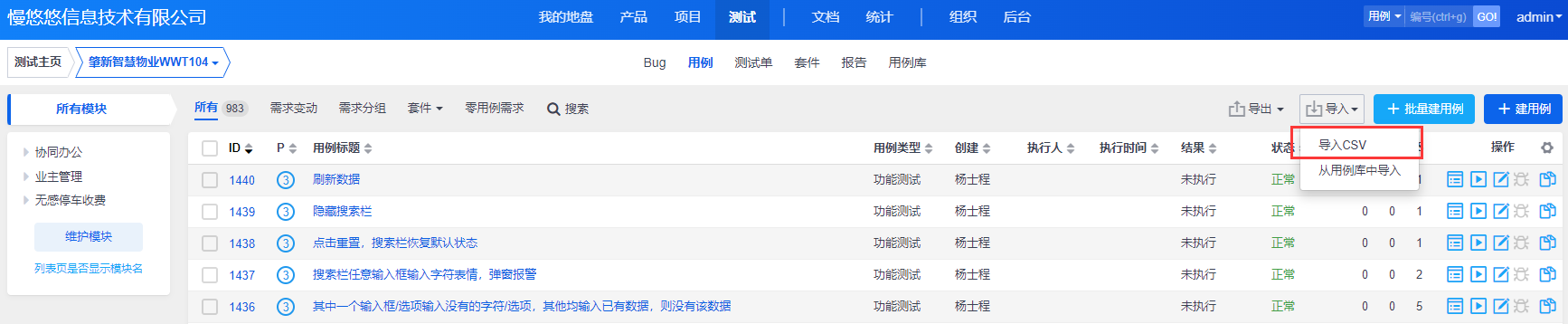 ③ 点击【测试】→【用例】→【导入】→【导入csv】,可以将外部表格的用例进行导入: