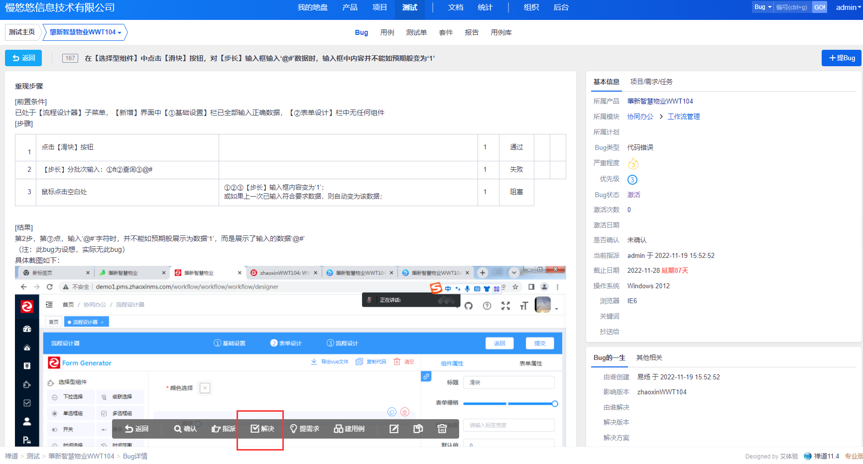 ② 进入bug详情页后,修复完bug,点击【解决】按钮: