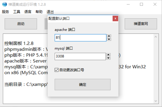 ⑤ 为避免冲突,将apache改为81,mysql改为3308,并勾选上“自动更改端口号”,如下图: