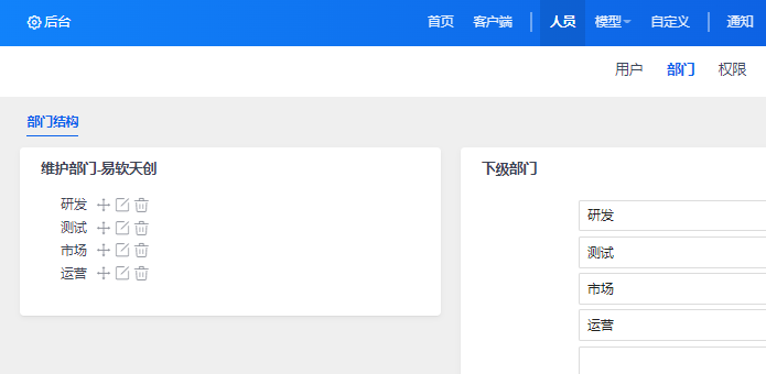 ① 点击【组织】→【部门】中,可以直接添加和维护部门: