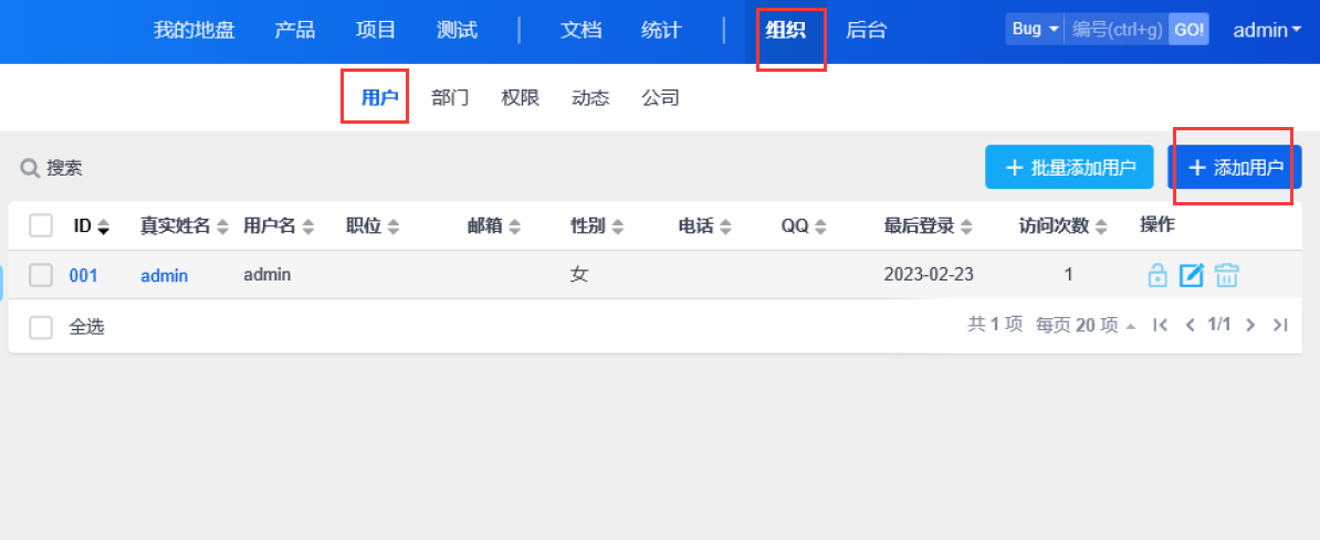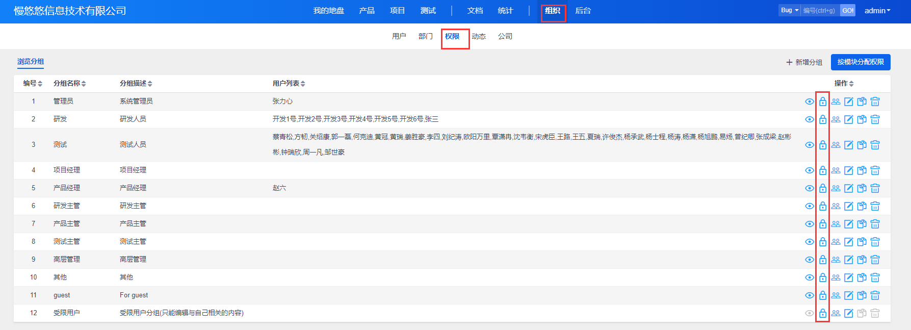 ② 点击【组织】→【用户】→【权限】中,可以修改人员的权限: