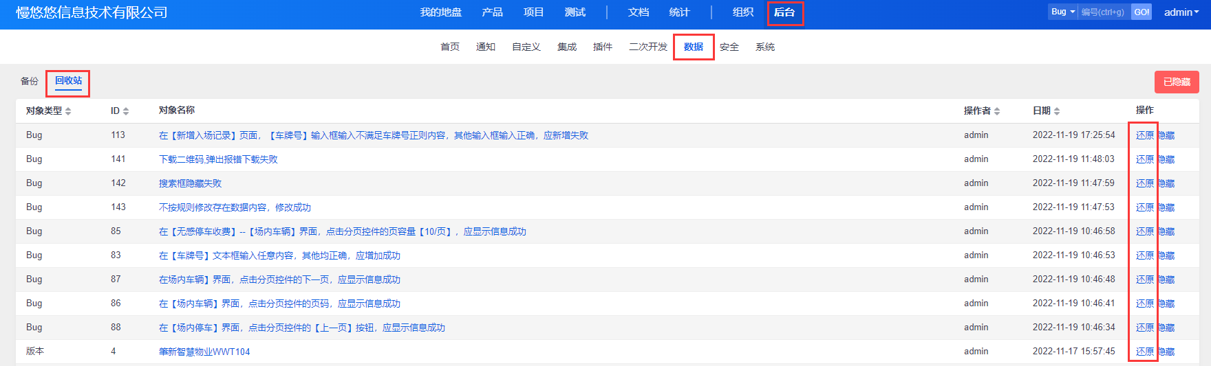 ① 点击【后台】→【数据】→【回收站】中,可以还原被删除的数据: