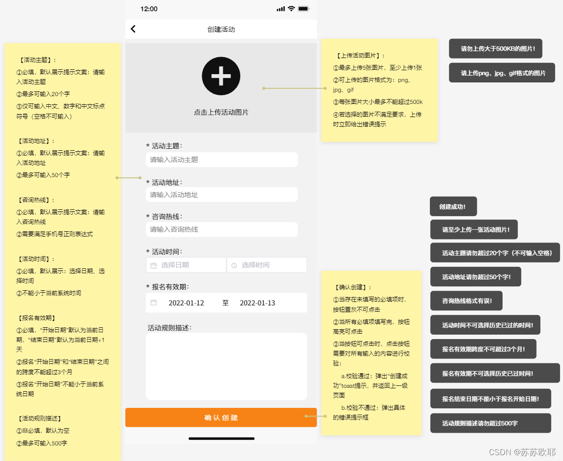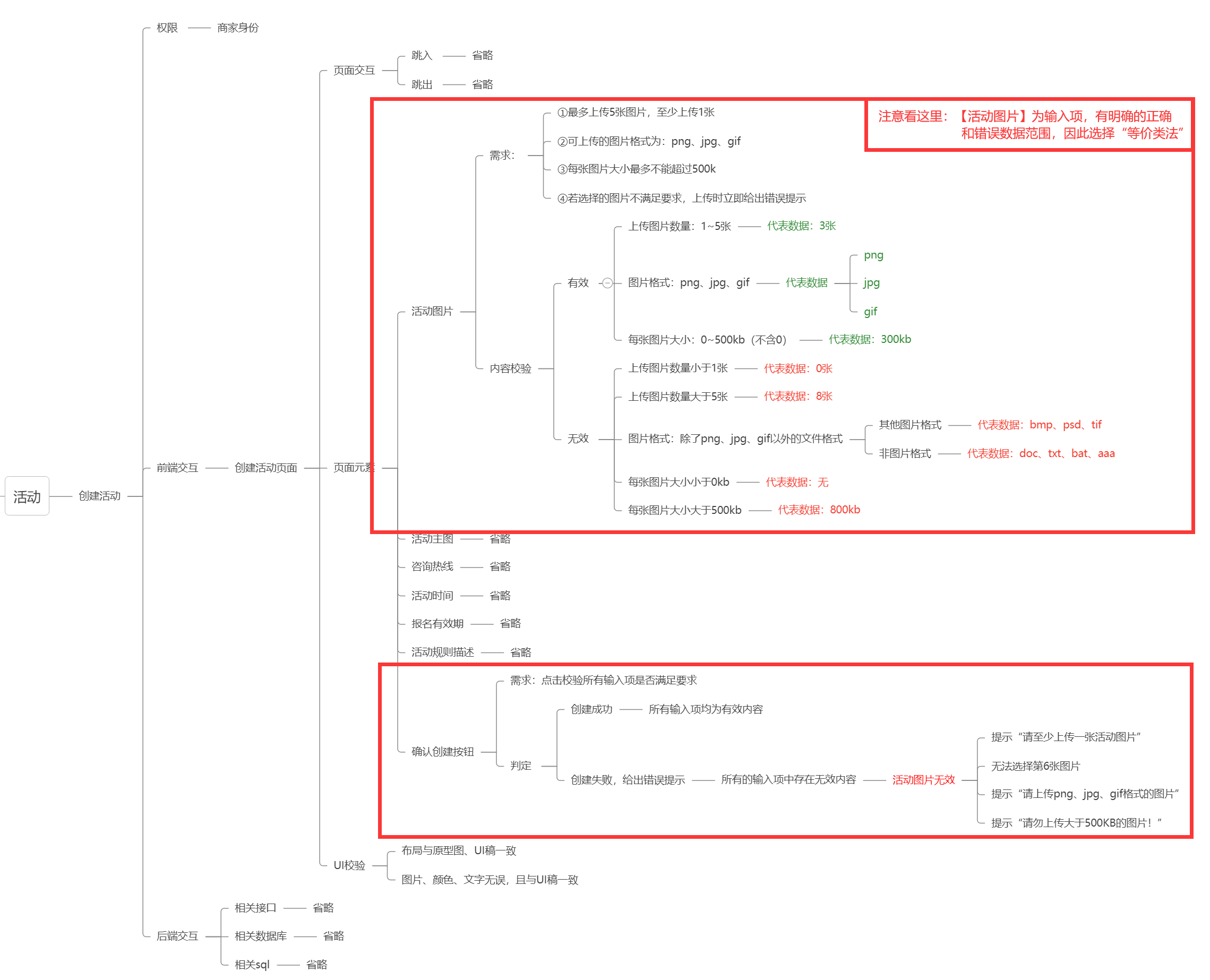 解析:这是一个典型的表单页面,主功能是“创建活动”。如图可见,界面中只有【选择控件】和【输入控件】,外加一个【提交按钮】, 产品经理将每个控件的输入条件、报错提示均进行了详细描述,因此我们可以轻松地使用等价类划分的方法来一个个控件分解需求