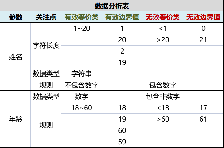注意:“年龄”的“规则”18~60 等同于 18、19、60、59,因此只要测试有效边界值即可,不需要专门再去有效等价类中找一个值