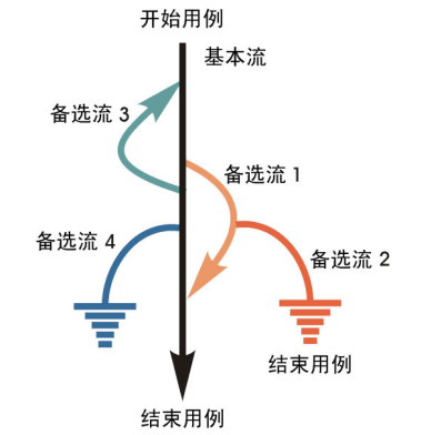 - 备选流2:始于备选流,一直偏离基本流,最终到场景结束也无法回到基本流