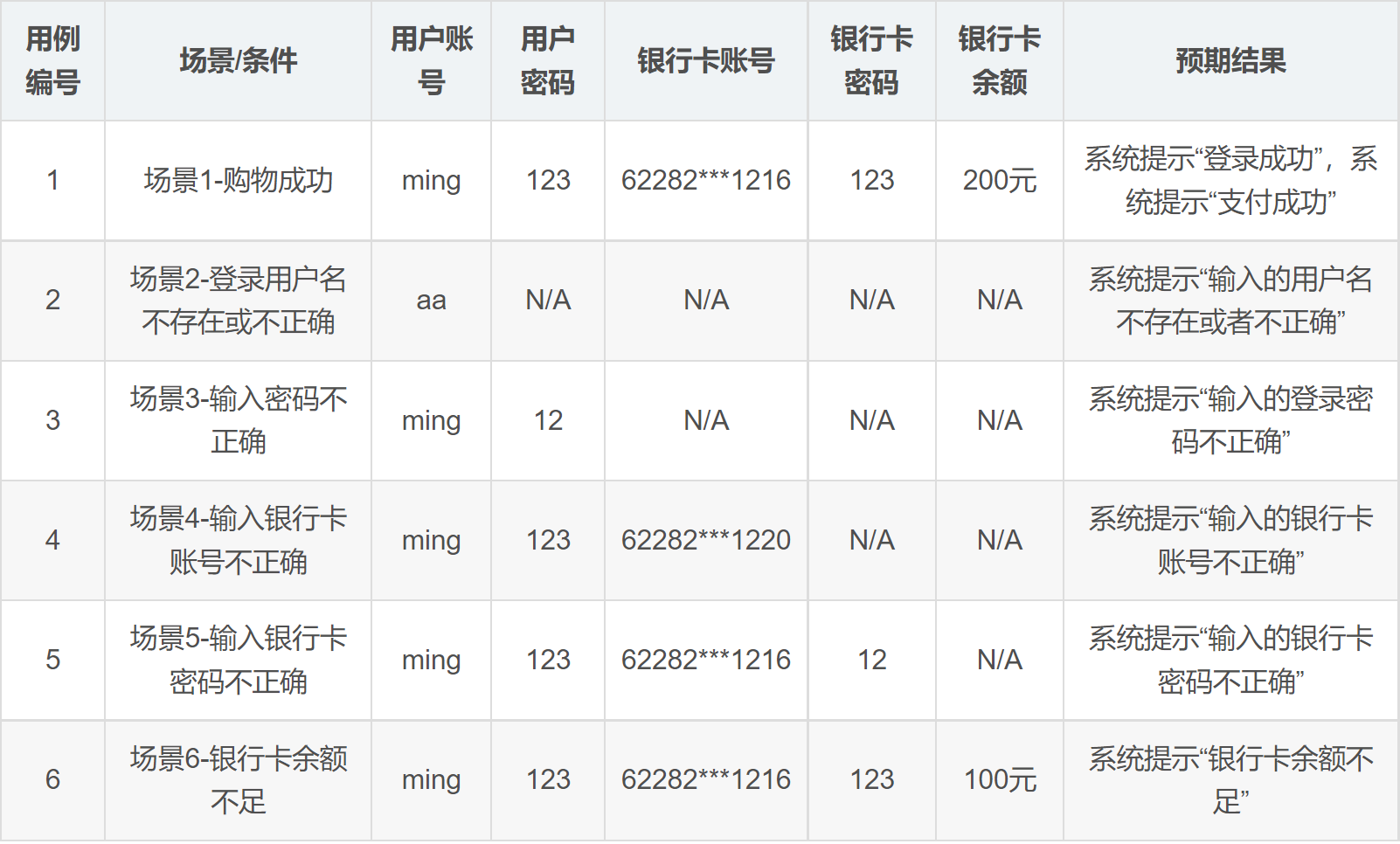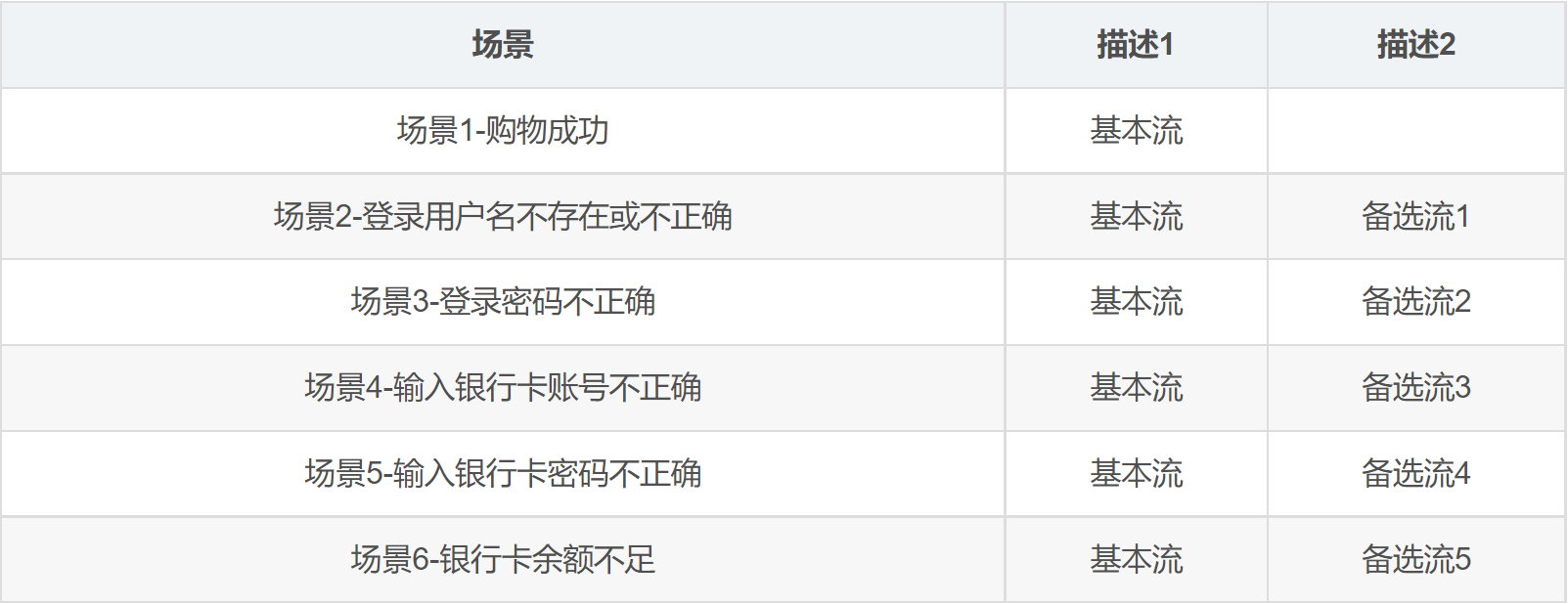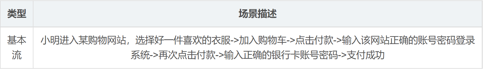 例:小明要在某购物网站上购买一件衣服,使用场景法设计测试用例