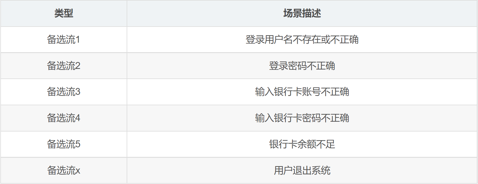- 备选流:软件功能在执行过程中,包含可能存在问题的各支流