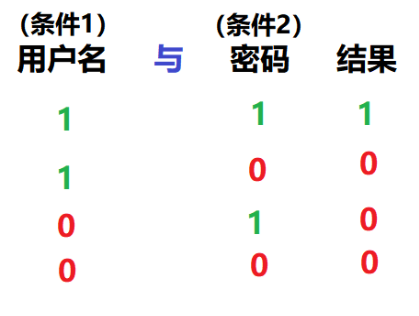 - 有0则0:所有的输入条件中存在1个假的,那么输出结果就是假的