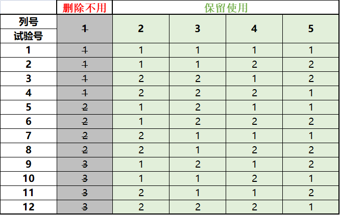 此时,k值有4个;m值是2,期望(24)没有直接可以使用的正交表,选择K值最接近的,L12(3×24)