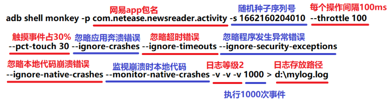 Monkey 在运行输出的信息包含一般四类,分别是测试命令信息,事件流信息,异常信息,执行结果信息: