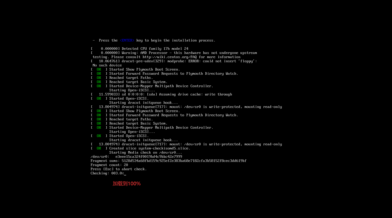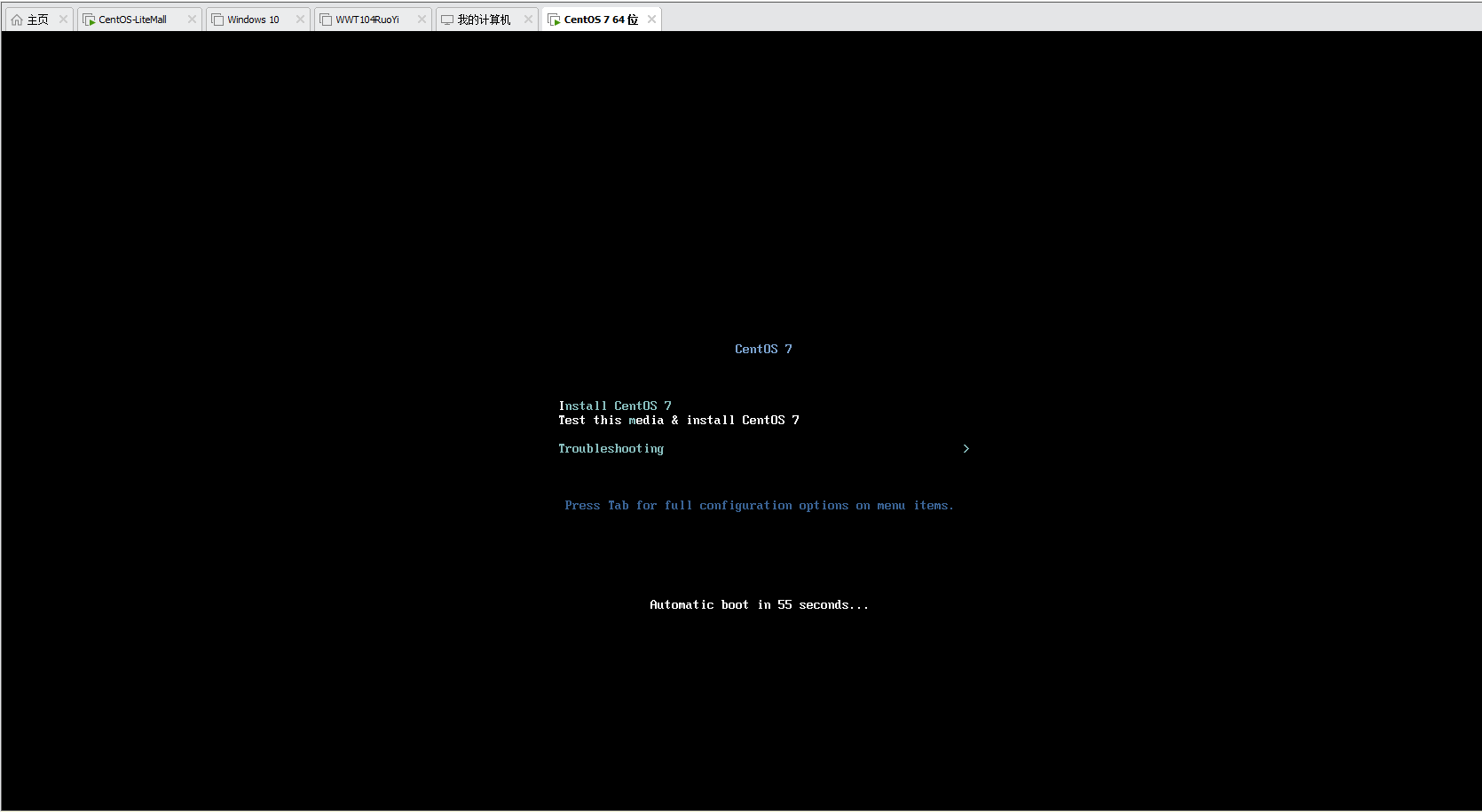 进入启动界面,可以将鼠标焦点移进虚拟机界面,按回车跳过该界面: