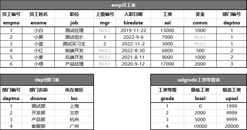 - 查询emp表中,[员工编号]、[员工姓名]、[职位],以及dept表中对应的[部门名称]、[部门地址]
