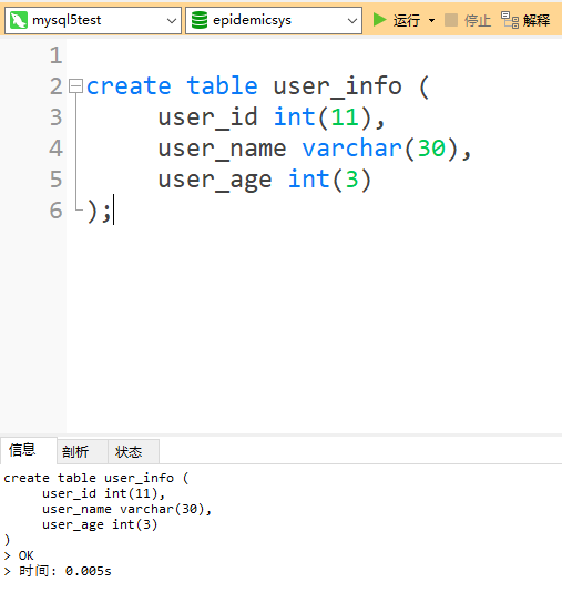 效果:创建表的同时,将user_id设置一个备注为“用户编号”注意:备注字需要用引号包裹