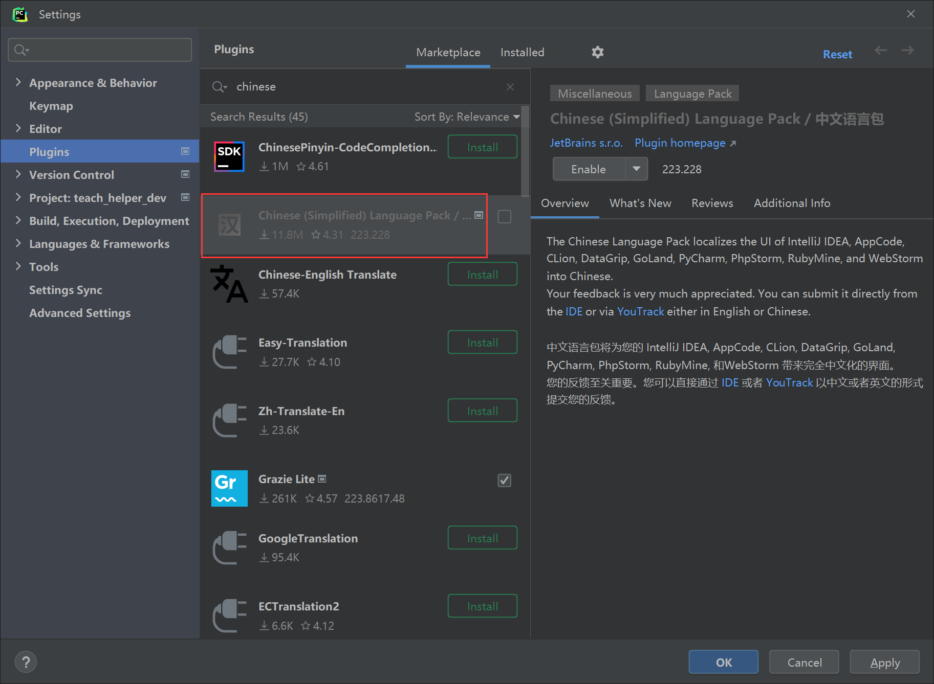 ② 选则plugins→选项卡Marketplace,输入chinese,安装插件: