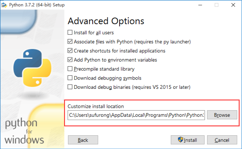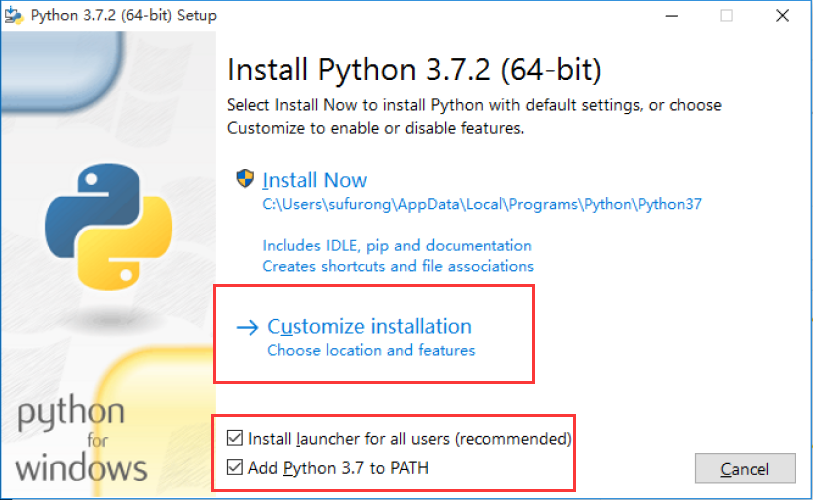 选择Customize installation自定义安装,勾选"add python 3.7 to Path"