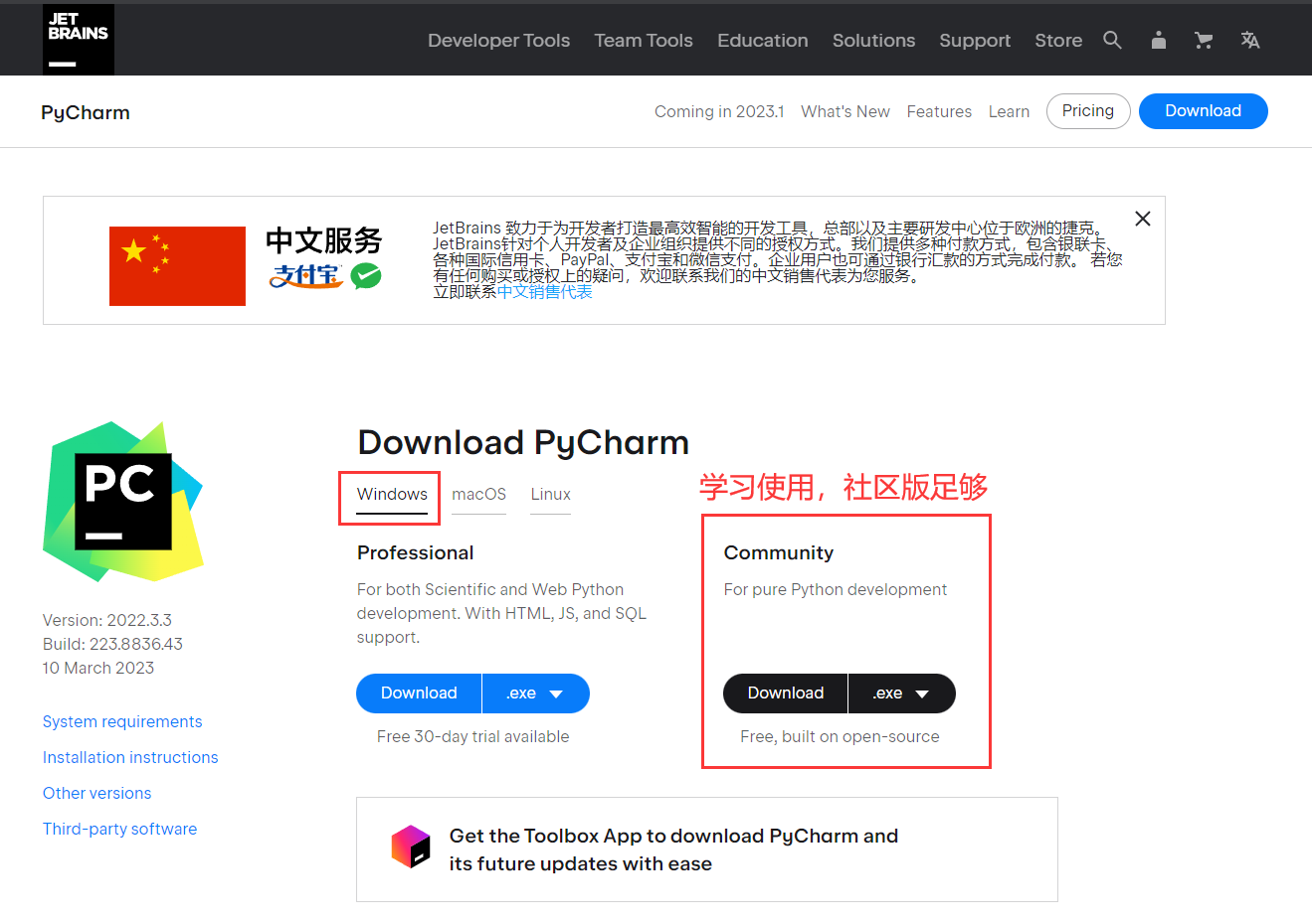 官方下载地址:https://www.jetbrains.com/pycharm/download/#section=windows