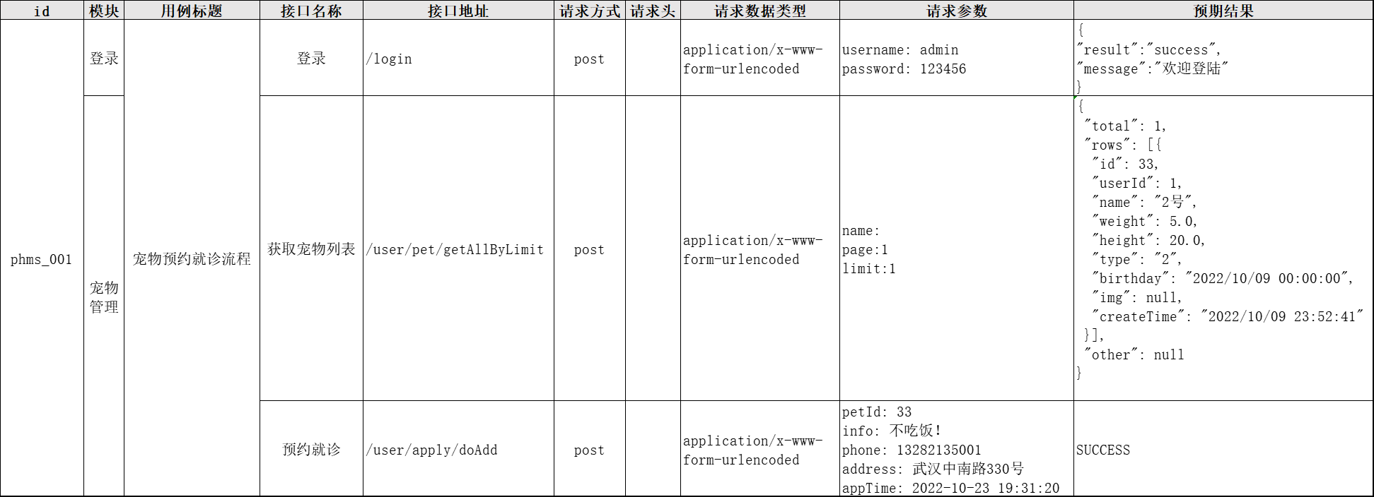 以“宠物医院”项目的“登录”接口为例: